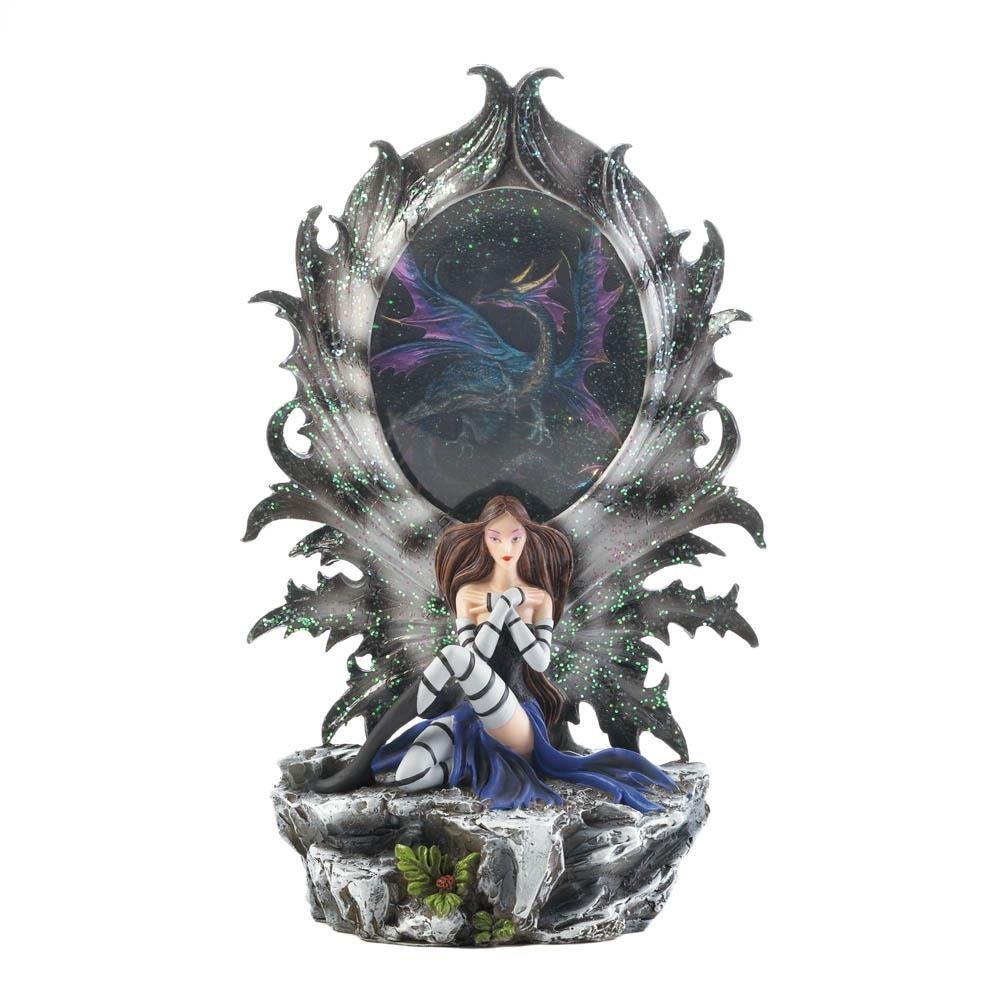 • This otherworldly decor accent will shimmer with mystical style on your shelf or desk. The amazing design features a pretty fairy resting against a dragon portal that lights up with the flip of a switch. This mesmerizing décor piece is an excellent gift and will look stunning perched on a shelf, desk, or table.