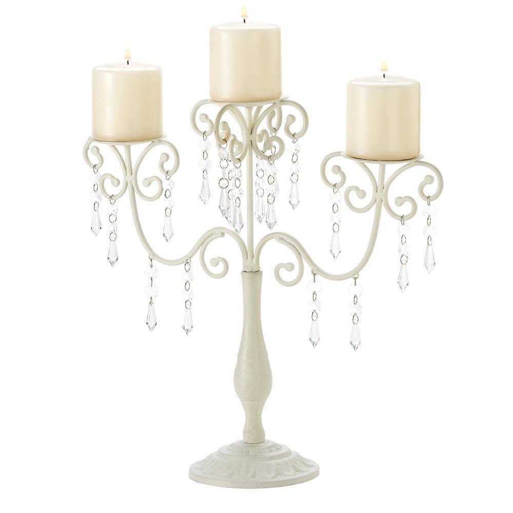 • Dripping with glittering crystals, graceful ivory curlicues create a showy support for a trio of candles. Delightfully extravagant with a touch of Old-World elegance!