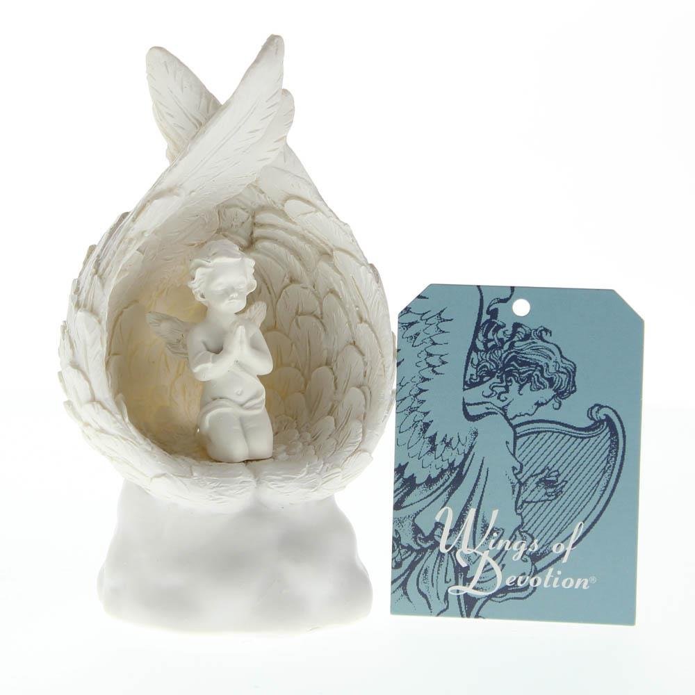 • Sheltered inside a pair of folded wings, this little cherub kneels in prayer as all around, soft lights bestow a rapturous glow. Can be used as elegant home décor or as a spiritual presence on any prayer table.