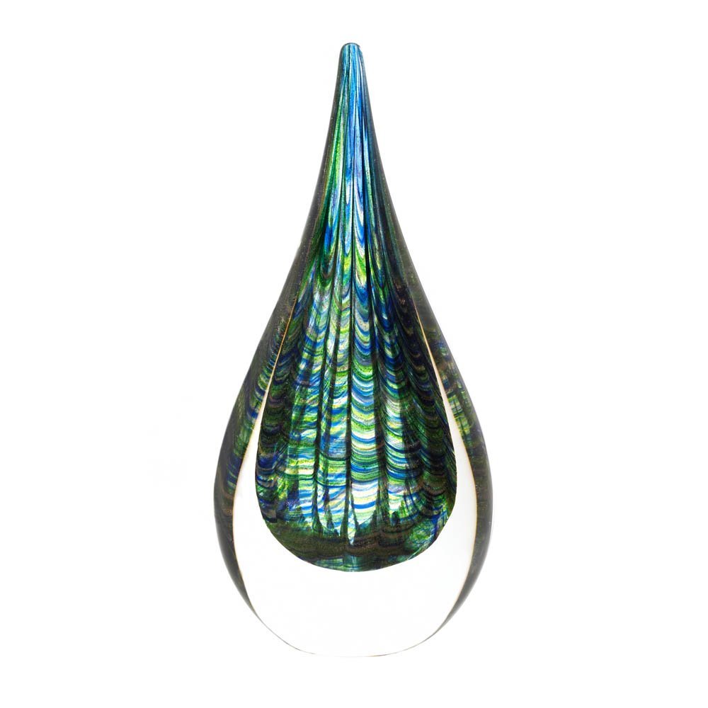 • Show off your great taste in decor with this beautiful art glass sculpture. The peacock-inspired coloring features striations of green, blue and gold that will capture attention and admiration from everyone who sees it. Each art piece is individually hand-crafted for its unique beauty and therefore might be slightly different from the picture shown here.