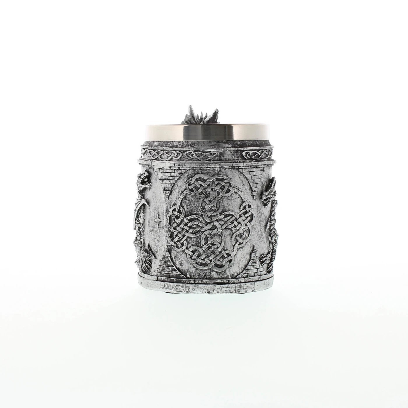 • This medieval-inspired mug is the most intimidating way to keep your items in order as a serpentine dragon guards your writing quills or your collection of coins stored within. Fully decorated with dragon reliefs and Celtic symbols, this mug will bring out the true warrior in you as it rests on your desk or bookshelf. (For decorative purposes only)