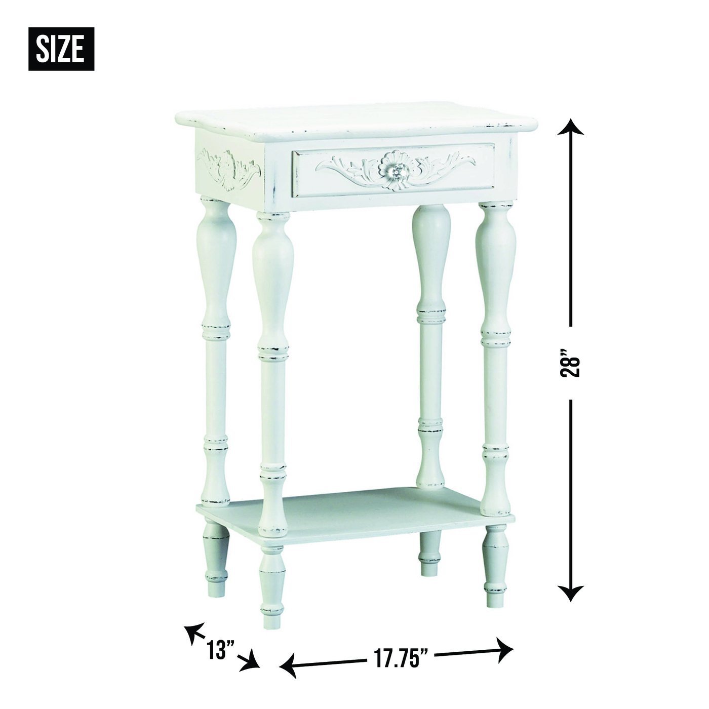• Shaped legs and shell-design trim add distinction to this decorative side table perfect for any space in your home. A generous drawer and a bottom shelf also provide plentiful storage.